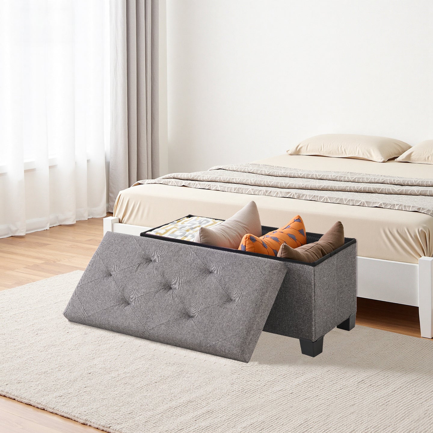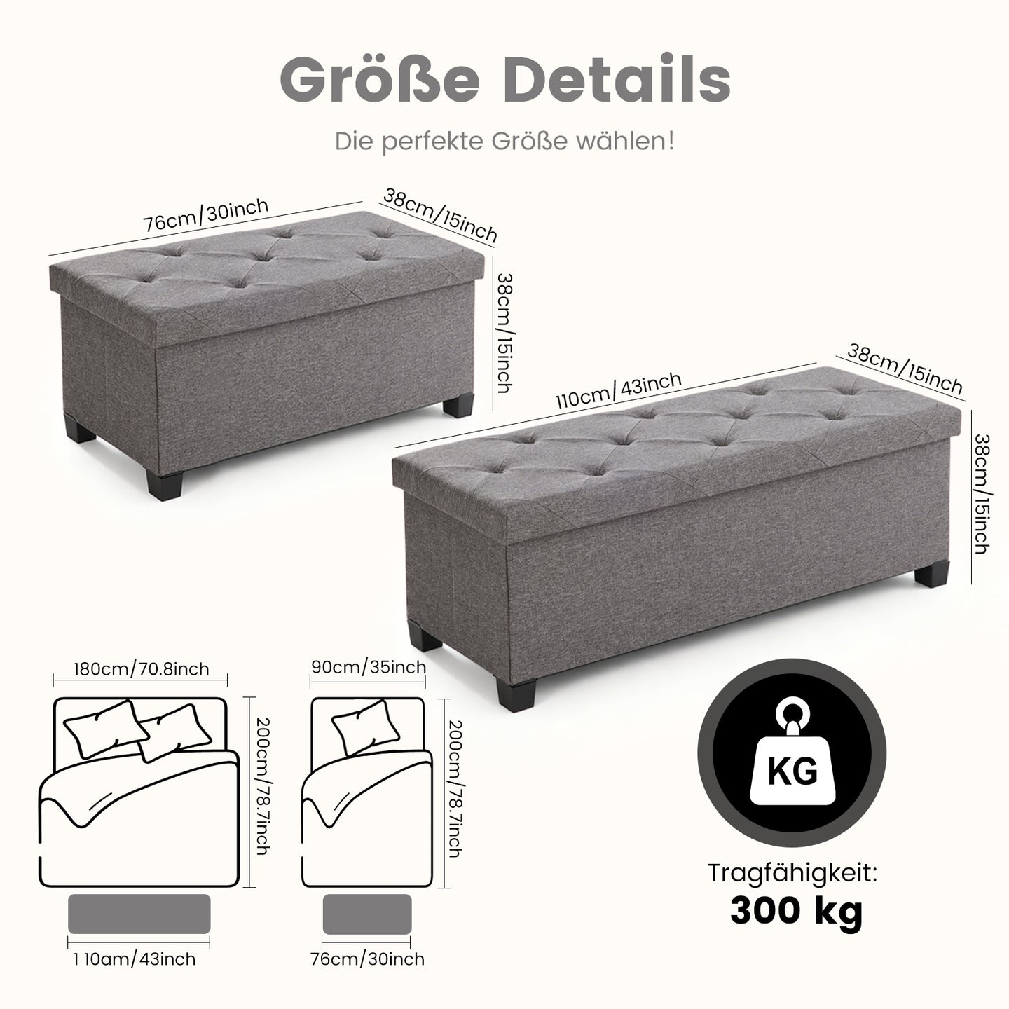 Mit einem Fassungsvermögen von 75-110 Liter bietet diese Bank großzügigen Stauraum für Spielzeug, Decken, Bettwäsche, Kissen oder Zeitschriften – ideal, um Ordnung zu halten. Perfekt für Wohnzimmer, Schlafzimmer oder Gästezimmer.