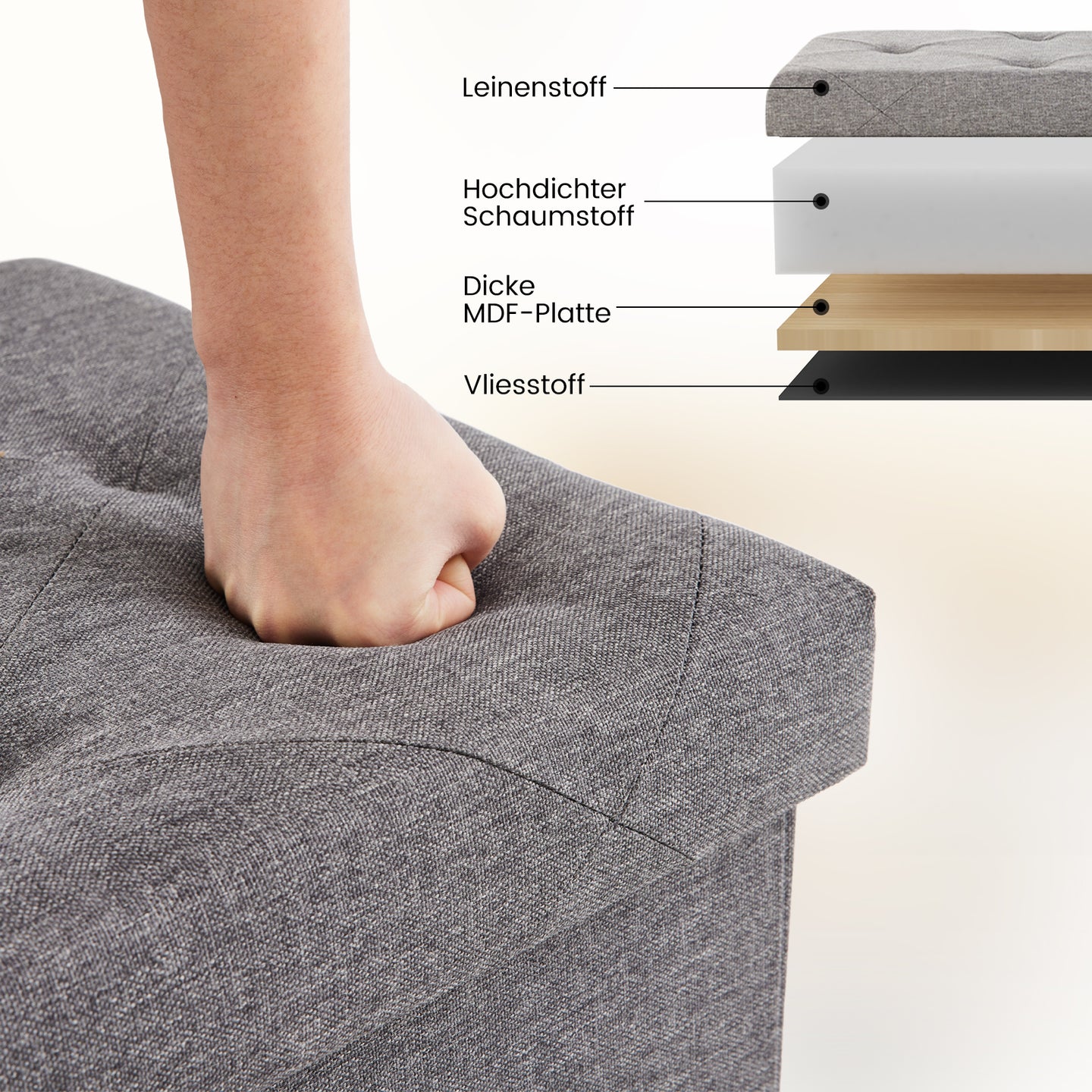 Hergestellt aus stilvollem Leinenstoff und hochdichtem Schaumstoff bietet dieses Ottoman eine bequeme Sitzfläche. Oberseite und Seiten sind mit dickem MDF verstärkt und tragen bis zu 300 kg.