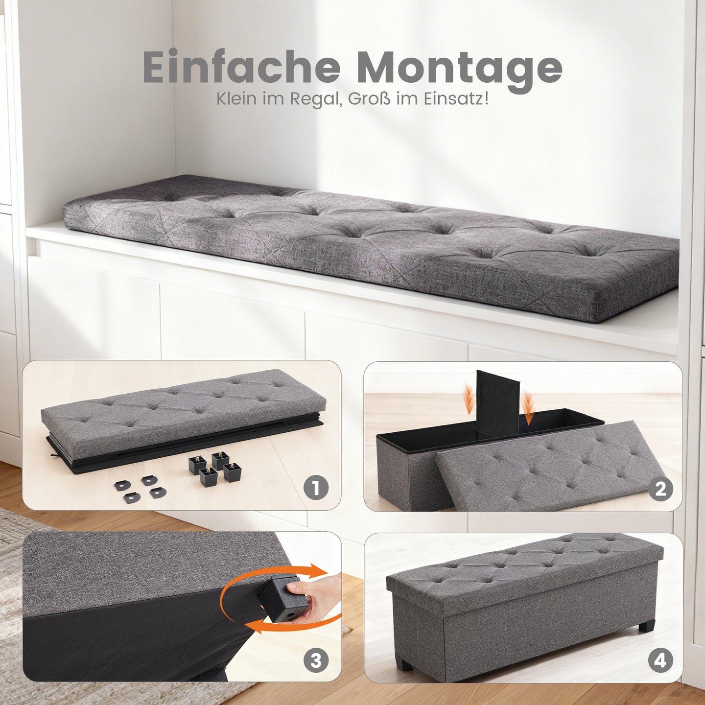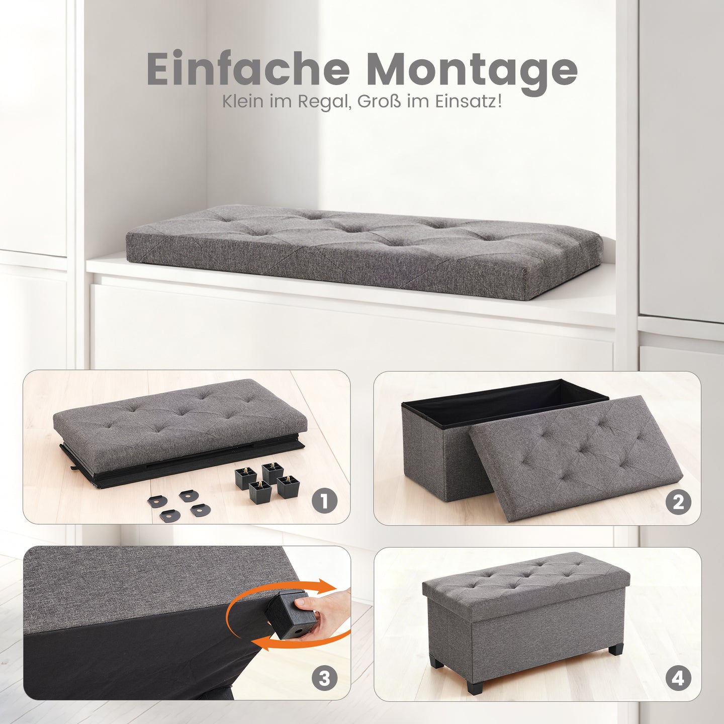 Die Bank lässt sich in Sekunden aufstellen und eignet sich ideal für das Fußende des Bettes oder den Schrank. Bei Nichtgebrauch kann sie flach zusammengeklappt werden, z. B. unter das Bett oder hinter die Tür.