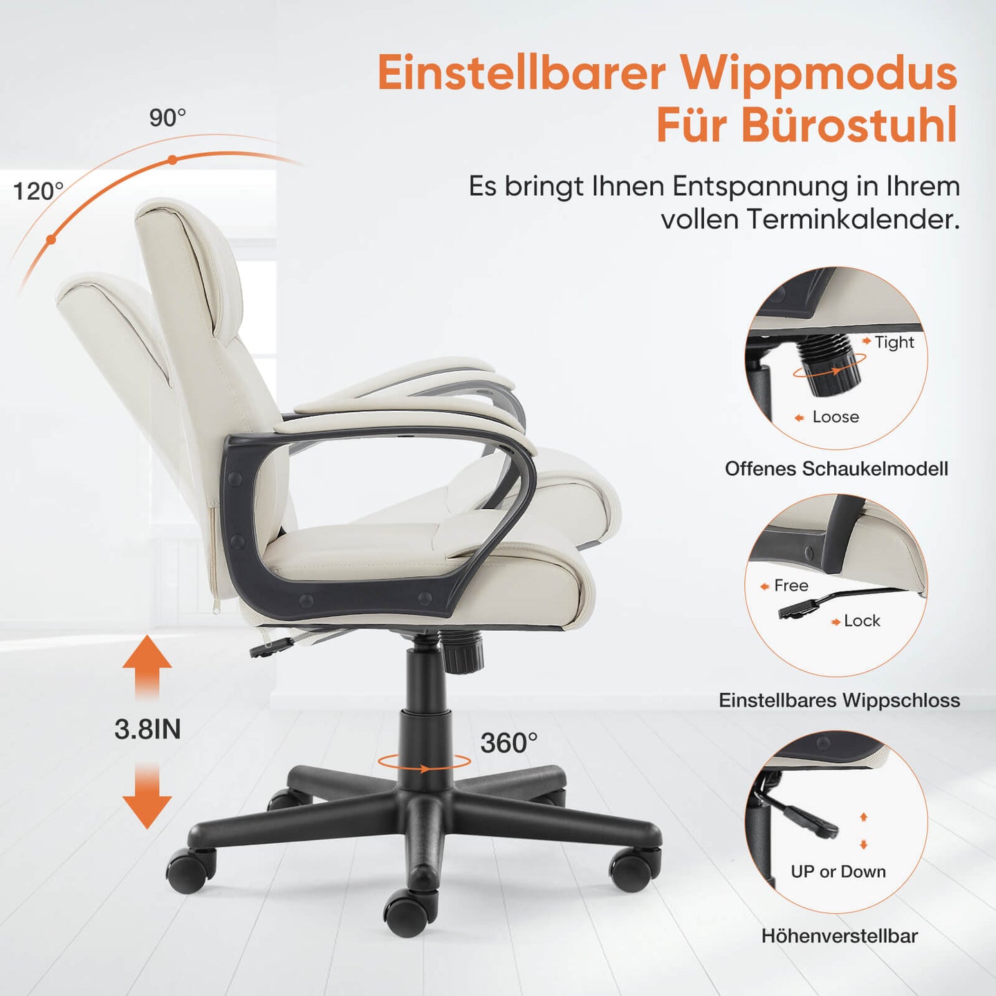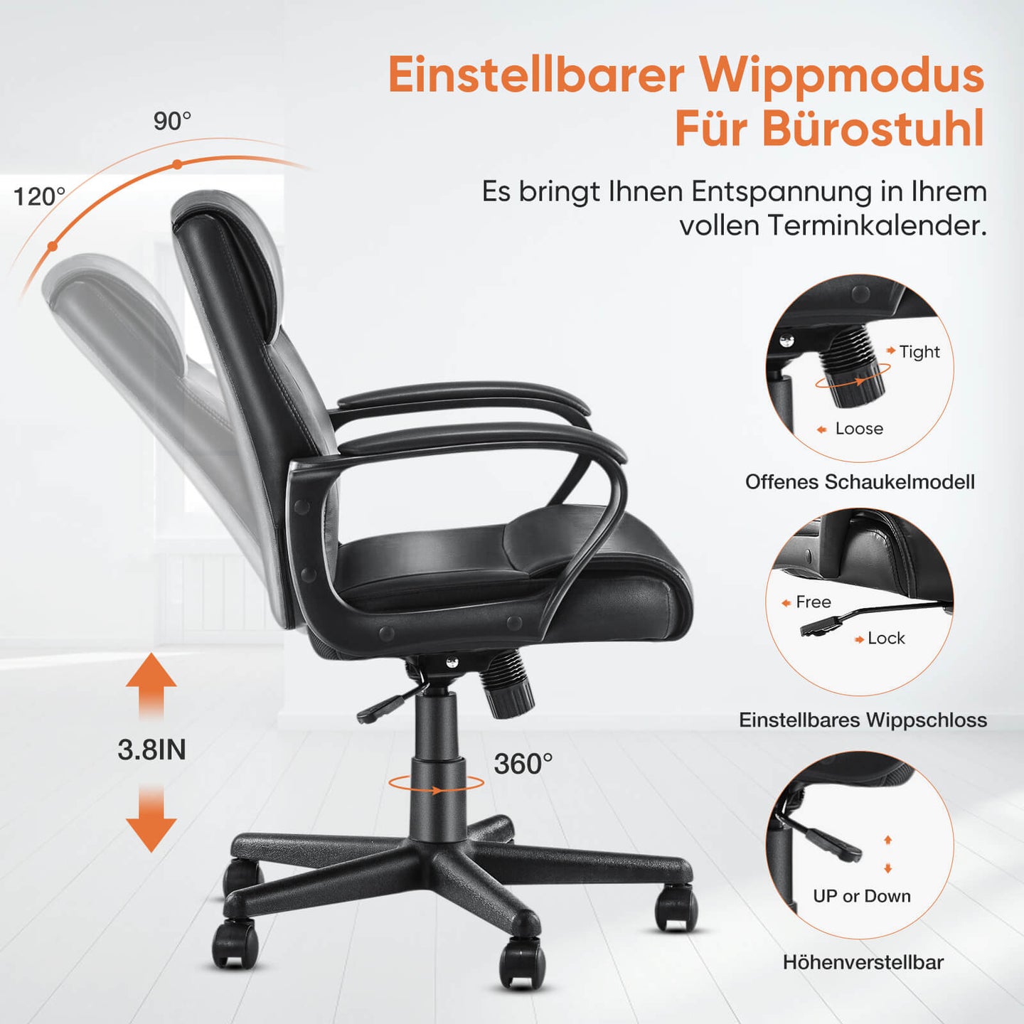 MULTIFUNKTION EINSTELLBAR - Dieser höhenverstellbare Bürostuhl, die verstellbare Kissenhöhe ist 18.3inch - 22.1inch, 4.2inch Bereich für Sie zu wählen. Darüber hinaus hat der Computer-Schreibtisch-Bürostuhl auch ein Schaukelmodell, ziehen Sie einfach den Griff, um die Rückenlehne (90°-120°) einzustellen, dieses Modell ermöglicht Ihre Lendenwirbelsäule, um einen besseren Liegewinkel zu finden, wodurch die Verletzung der Wirbelsäule.