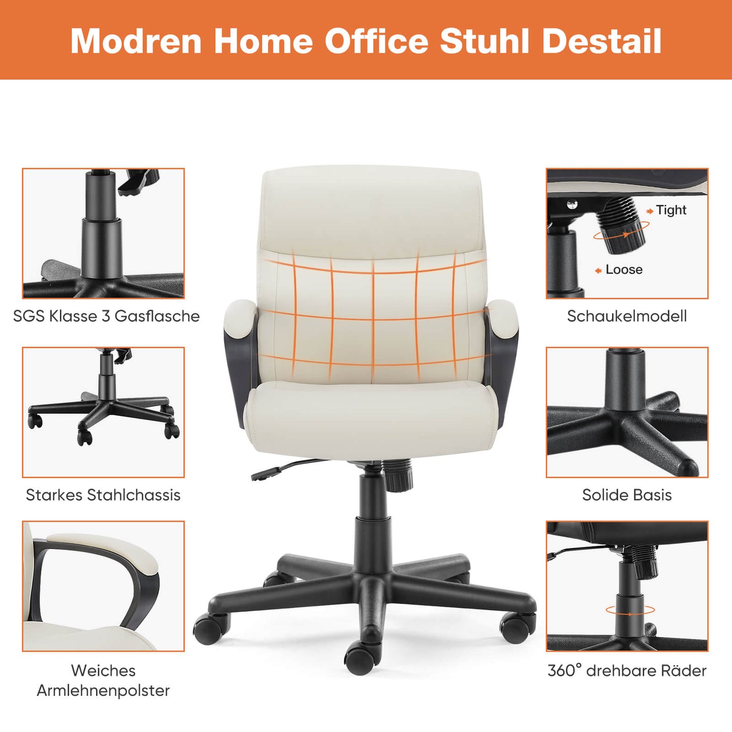 STURDY BASE - Die Basis dieses Bürostuhls nimmt eine robuste und langlebige fünfzackige Sternstruktur, sowie eine aktualisierte 3-Stufen-Luftfeder-Luftpumpe, die reibungslos angehoben und abgesenkt werden kann, und das maximale Stützgewicht ist bis zu 270 Pfund, die Ihre Sicherheit gewährleisten kann. Und der Stuhl hat 360° drehbare Rollen, die Ihnen helfen können, die Effizienz zu verbessern, und das hochwertige Material ist für jedes Bodenmaterial geeignet.